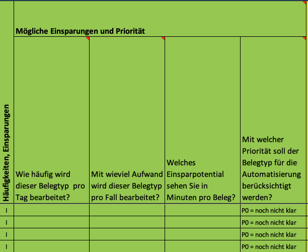 - Häufigkeiten, Einsparungen, hier können Sie pro Fall hinterlassen, wie häufig dieser Belegtyp/Zeiteinheit auftaucht, wie lange Sie an dem Fall arbeiten müssen, bis dieser geklärt ist (bitte die Zeit Ihrer Kollegen dazu addieren), welches Einsparpotential Sie sehen, wenn der Beleg automatisch verarbeitet würde und welche Priorität dieser Beleg im Projekt haben sollte. Dieses Feld ist ein MUSS-Feld. Hier müssen Sie sich entscheiden, damit die automatisierte Verarbeitung dieses Belegs zum Leistungsumfang Ihres Projektes wird.