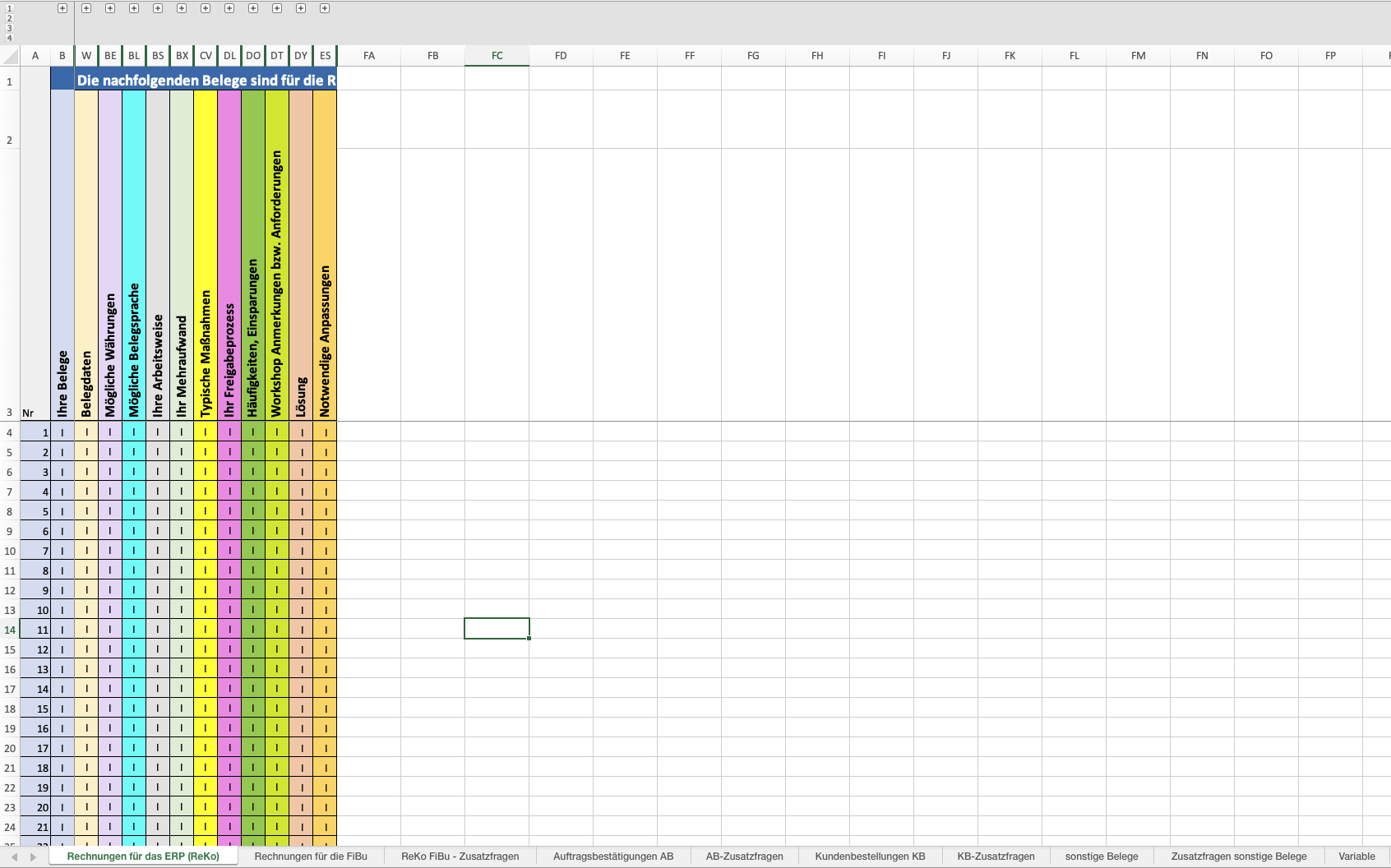 Die Blätter, in denen Ihre Beispielbelege, in jeweils einer Zeile mit vielen Details erfasst werden können, sind in Bereiche unterteilt, die sich in zwei Gruppen aufteilen lassen.