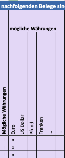 - Mögliche Währungen, hier hinterlassen Sie bei dem jeweiligen Dokument, mit einem X, die gewählte Währung. (MUSS-Feld)