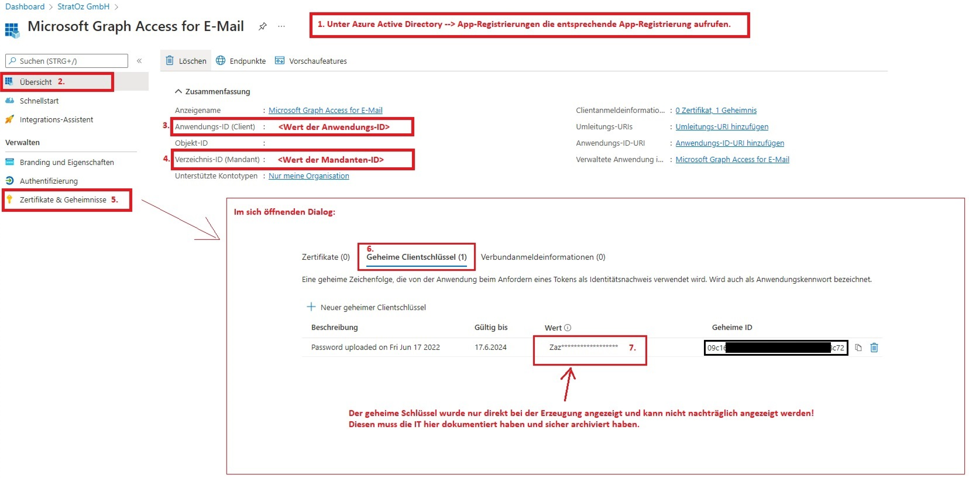 Der Folgende Screenshot kann als Hilfestellung zur ermittlung der Erforderlichen Informationen aus dem Microsoft Graph Access verwendet werden. Die Verantwortung für Vollständigkeit und Richtigkeit der übermittelten Informationen liegt jedoch auf Kundenseite:
