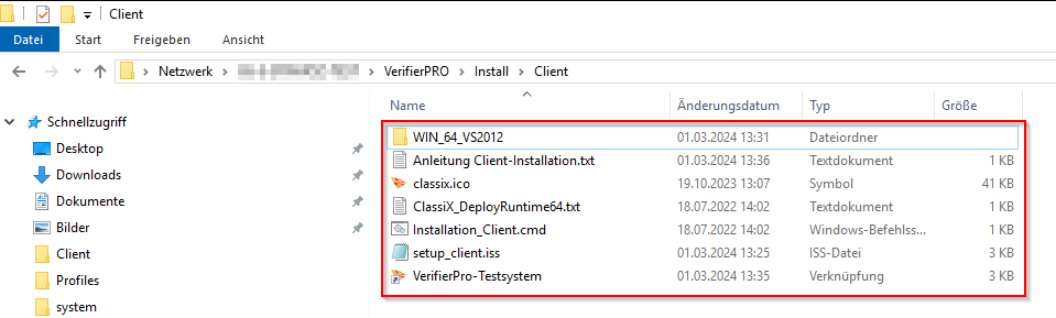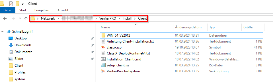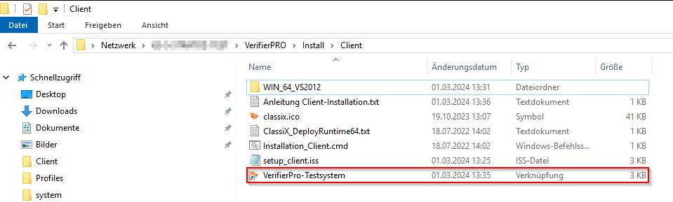 Der bereitgestellte Ordner für die Client Installation ist unter "\\*Servername*\VerifierPro\Install\Client" zu finden