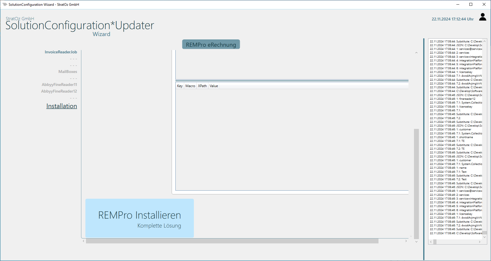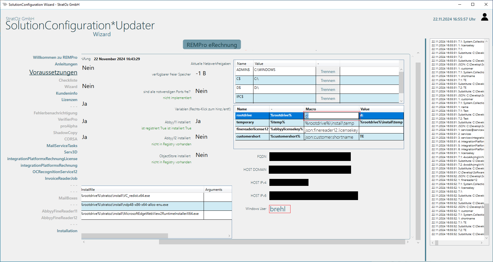 Hier sind auf der rechten Seite Variablen gesetzt (Hinweis: Je nach Auflösung bzw. die Größe des Fenster, muss eventuell nach rechts gescrollt werden). Die Variable "rootdrive" muss auf den Laufwerkbuchstaben gesetzt werden, unter dem die REMPro Lösungstrecke installiert ist. Durch einen Doppelklick auf das entsprechende Feld in der Spalte "Macro" können Sie den Wert anpassen (z.B. C:\ oder D:\).