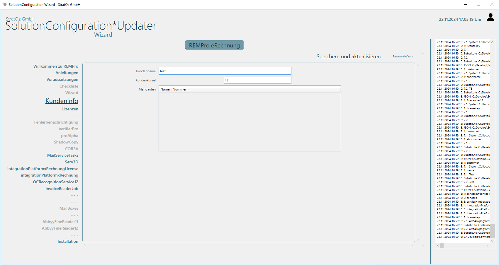 Nachdem der Laufwerksbuchstabe angepasst wurde, muss in der linken Leiste auf "Kundeninfo" geklickt werden. Hier müssen entsprechend der Kundenname und das Kundenkürzel angegeben werden. Mandanten müssen nicht hinzugefügt werden.