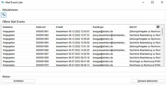 In der Vergangenheit kam es vor, dass E-Mails nicht versendet wurden, weil hier der Empfänger nicht korrekt in den Stammdaten hinterlegt war. Hier ist nun administrativ eine einfachere Kontrolle möglich und Mailevents lassen sich hier auch im Bedarfsfall abbrechen.