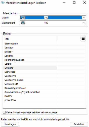 Es öffnet sich ein Folgedialog. Wählen Sie hier den Quellmandanten aus, aus dem die Daten in den aktuellen Mandanten übertragen werden sollen. Wählen Sie dann die oder den entsprechenden Reiter aus der Liste aus, der übernommen werden soll. Klicken Sie im Anschluss auf "Übertragen"