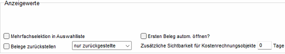 Gehen Sie in die Einstellungen im Editierdialog über das Menü. Wenn der erste Beleg in der Selektionsliste immer auch direkt beim Öffnen mit angezeigt werden soll, dann selektieren Sie die Checkbox "Ersten Beleg beim Start anzeigen".